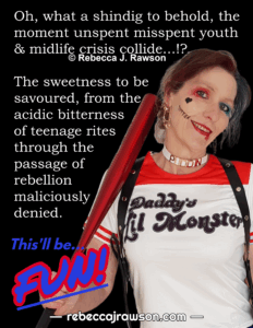 I may be 40 years overdue for my non-negotiable rite of passage through rebellion, which should have begun being increasingly permitted from 13 years of age. Nevertheless I am bang on time for the crisis of midlife awakening by Reality Incarnate, Dark Humour and the goddess of memory, Mnemosyne.
